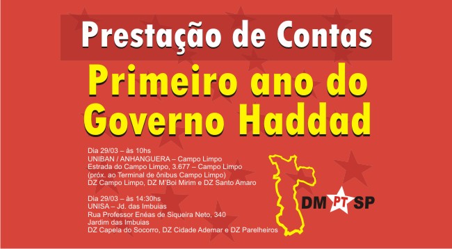 Diretório Municipal do PT dá inicio as plenárias de Prestação de Contas do primeiro ano do Governo Haddad em São Paulo: Investimentos superiores aos dos governos Serra e Kassab