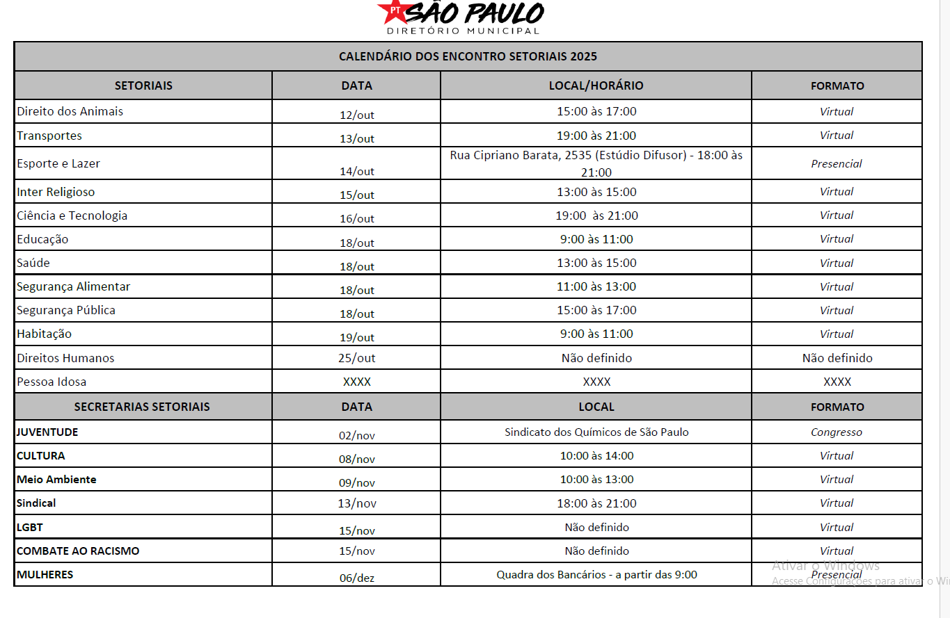 O diretório municipal do PT está realizando os encontros setoriais do partido. Confira o calendário.